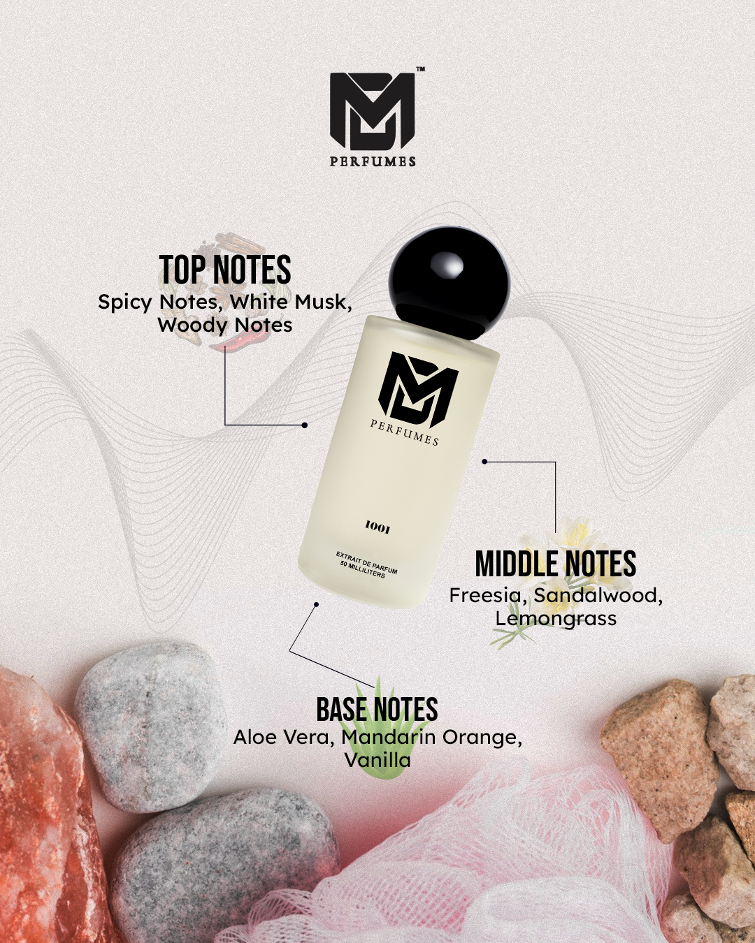 1001 is a fragrance woven from the magic of Arabian tales. It begins with the radiant spice of saffron and the elegance of rose, softened by a hint of citrus. The heart unfolds into rich oud and warm spices, evoking mystery and grandeur. Finally, the base of amber, musk, and sandalwood lingers with depth, creating a trail as enchanting as the stories that inspired it.