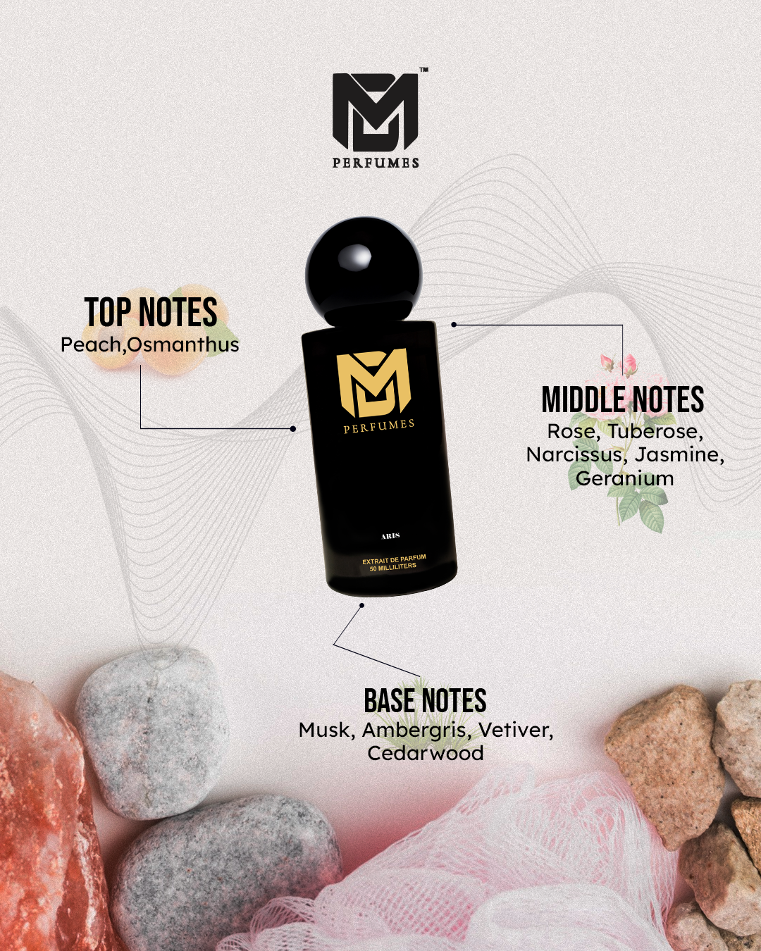 ARIS is a fragrance of grace, charm, and timeless femininity. It begins with a fresh sparkle of citrus and aldehydes, luminous and uplifting. At its heart, rose and jasmine bloom elegantly, softened by lily-of-the-valley for a delicate touch. The base of musk, sandalwood, and amber adds warmth and depth, leaving a refined trail that is soft yet unforgettable.