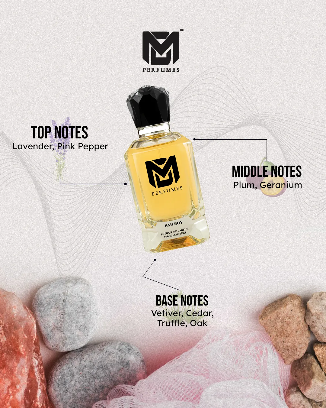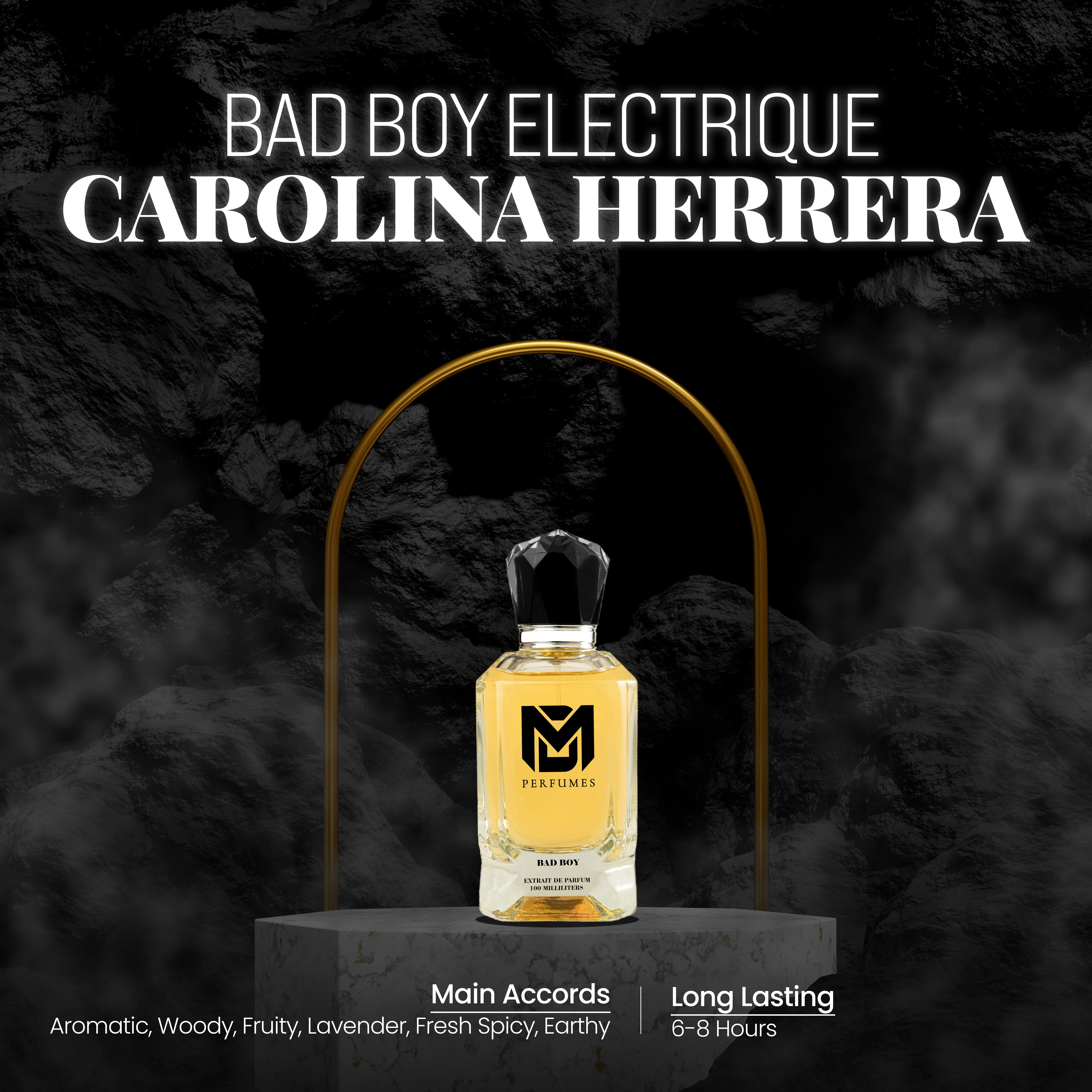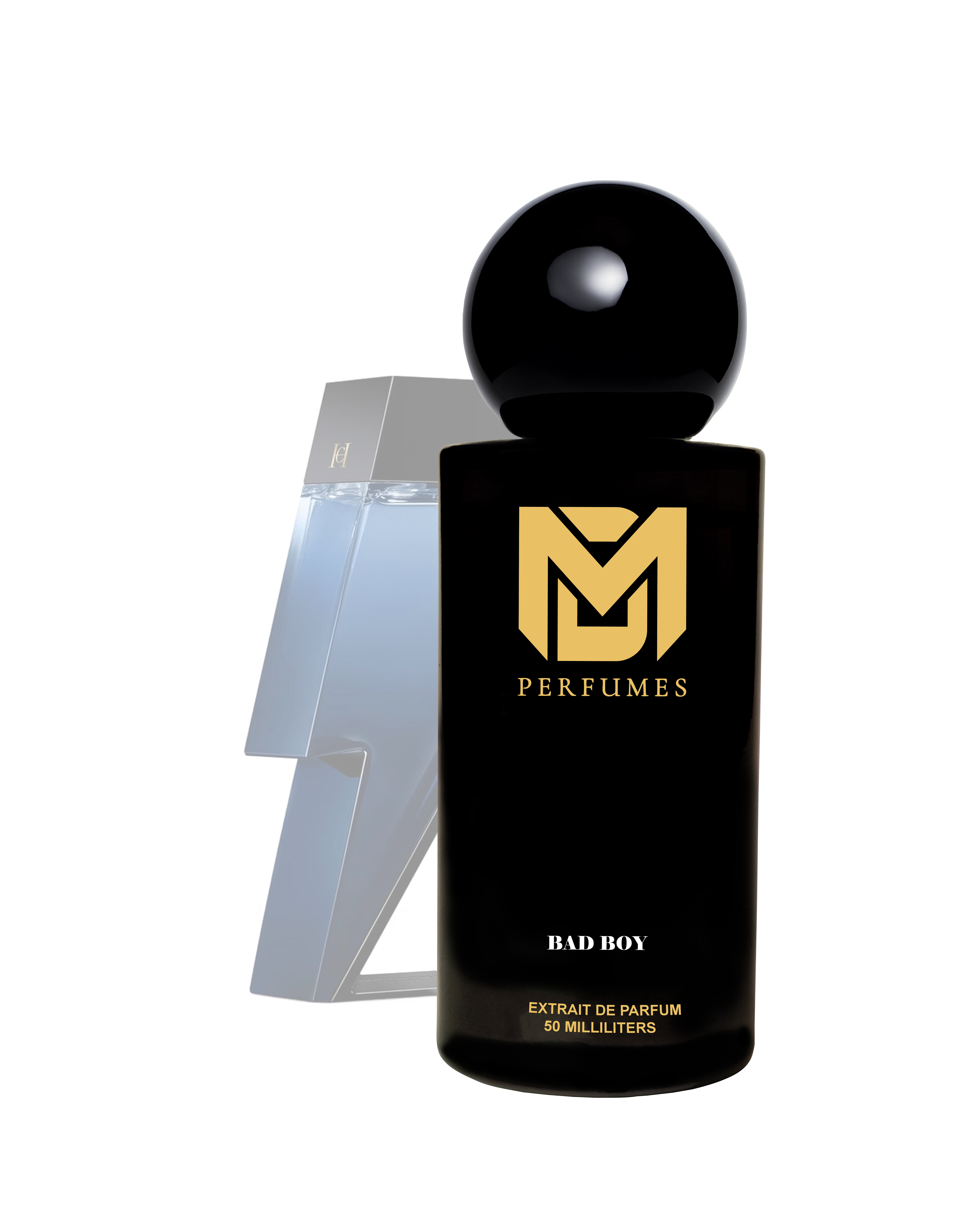 BAD BOY is a fragrance of contrasts—strength and sensitivity, boldness and charm. It begins with an electric burst of black and white pepper, lifted by fresh bergamot, sparking instant intrigue. The heart blends cedarwood and sage, creating a refined yet powerful core. Finally, the fragrance settles into a seductive base of tonka bean, cacao, and amberwood, warm and irresistible.