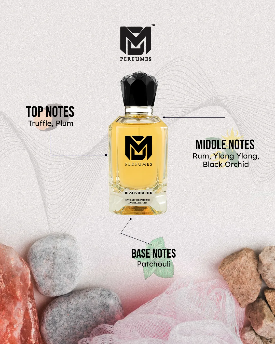BLACK ORCHID is the embodiment of mystery, power, and sensual elegance. It opens with an unforgettable burst of black truffle and dark fruits, enriched by ylang-ylang and citrus for a decadent first impression. At its heart lies the rare black orchid, exotic and intoxicating, surrounded by floral spice and velvet sweetness. The base lingers with patchouli, incense, vanilla, and rich chocolate, weaving an aura of opulence that is bold, seductive, and eternal.