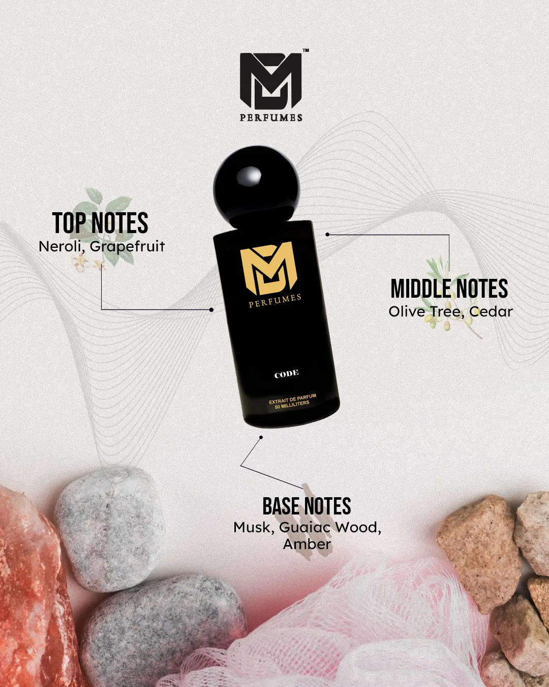 CODE is the essence of mystery and seduction, bottled in timeless elegance. It begins with a spark of lemon and bergamot, sharp yet refined, awakening curiosity. The heart introduces the unique richness of olive blossom and star anise, blended with the depth of guaiac wood—an aromatic core that is both exotic and magnetic. The journey concludes with tonka bean, leather, and tobacco, leaving a warm, sensual trail that whispers of sophistication and power.