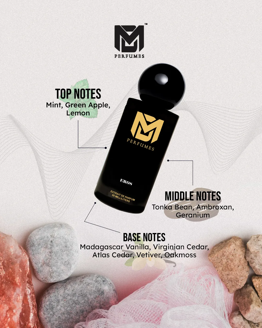 EROS is the fragrance of passion, power, and seduction. It opens with a vibrant rush of mint, green apple, and lemon, fresh and energizing. The heart reveals tonka bean and ambroxan, sweet and magnetic, balanced by the elegance of geranium. Finally, the scent settles into vanilla, vetiver, and cedarwood, leaving a warm, sensual trail that commands attention.