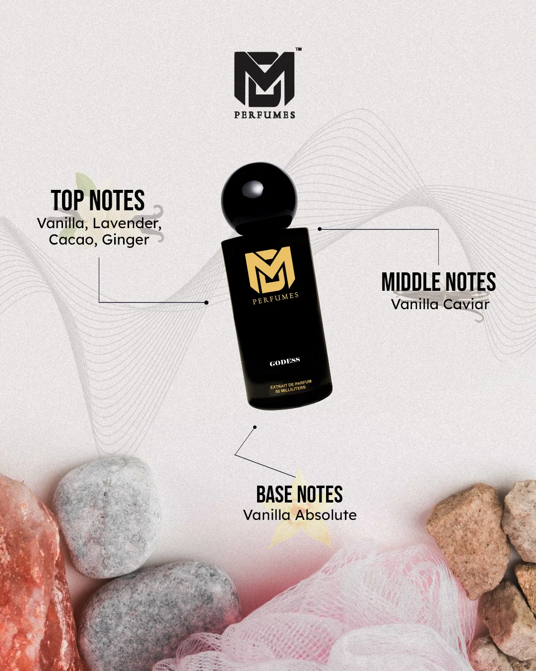 GODDESS is a fragrance of divine femininity, radiant confidence, and timeless grace. It begins with a luminous vanilla infusion, soft yet powerful, wrapping the senses in sweetness. The heart unveils vanilla caviar and delicate lavender, creating a unique harmony of warmth and freshness. Finally, a deep base of vanilla absolute, cocoa, and tonka bean lingers, sensual and indulgent, leaving an unforgettable trail.