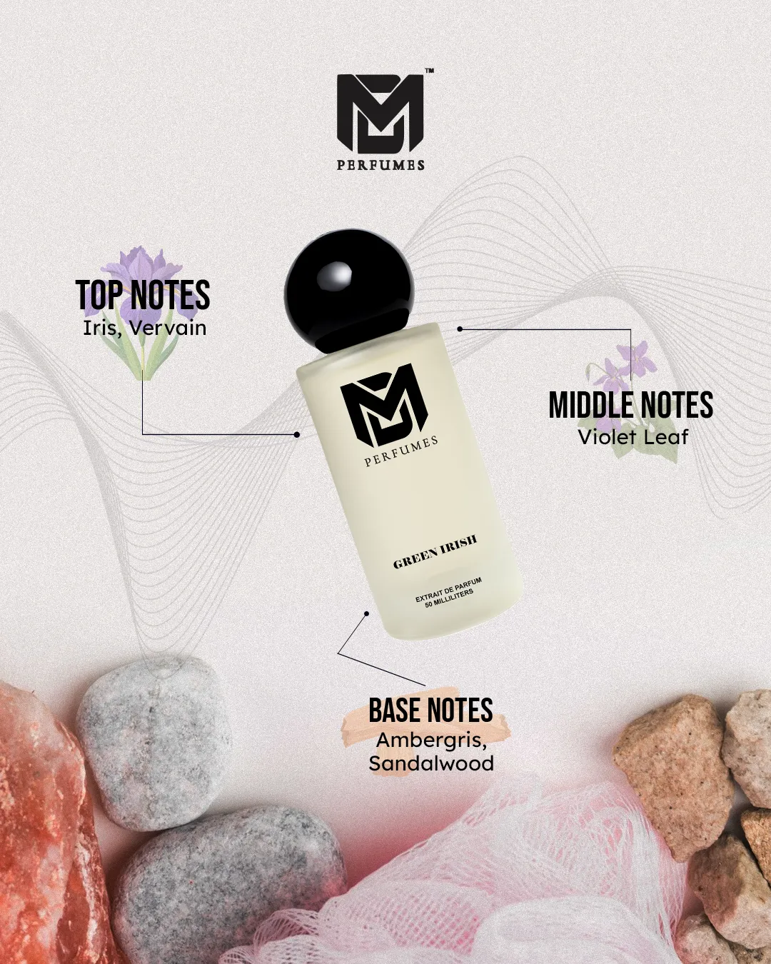 GREEN IRISH is a fragrance of timeless elegance and quiet power. It begins with a crisp freshness of lemon, verbena, and peppermint, bright and invigorating like a walk through open fields. The heart reveals violet leaf, deep and green, bringing character and distinction. The scent settles into a base of ambergris and sandalwood, warm yet refined, leaving a trail of sophistication that is both classic and enduring.
