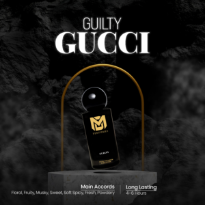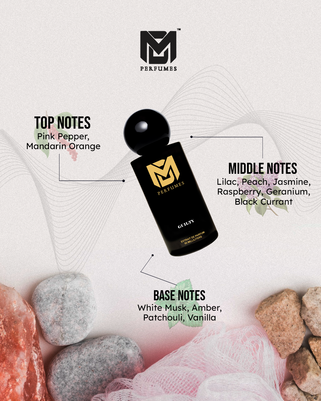 GUILTY is the fragrance of unapologetic desire and fearless confidence. It opens with sparkling mandarin and pink pepper, playful yet provocative. At its heart, lilac and peach blossom create a romantic softness touched with allure. Finally, a warm base of amber and patchouli settles deep and sensual, leaving an unforgettable trail.