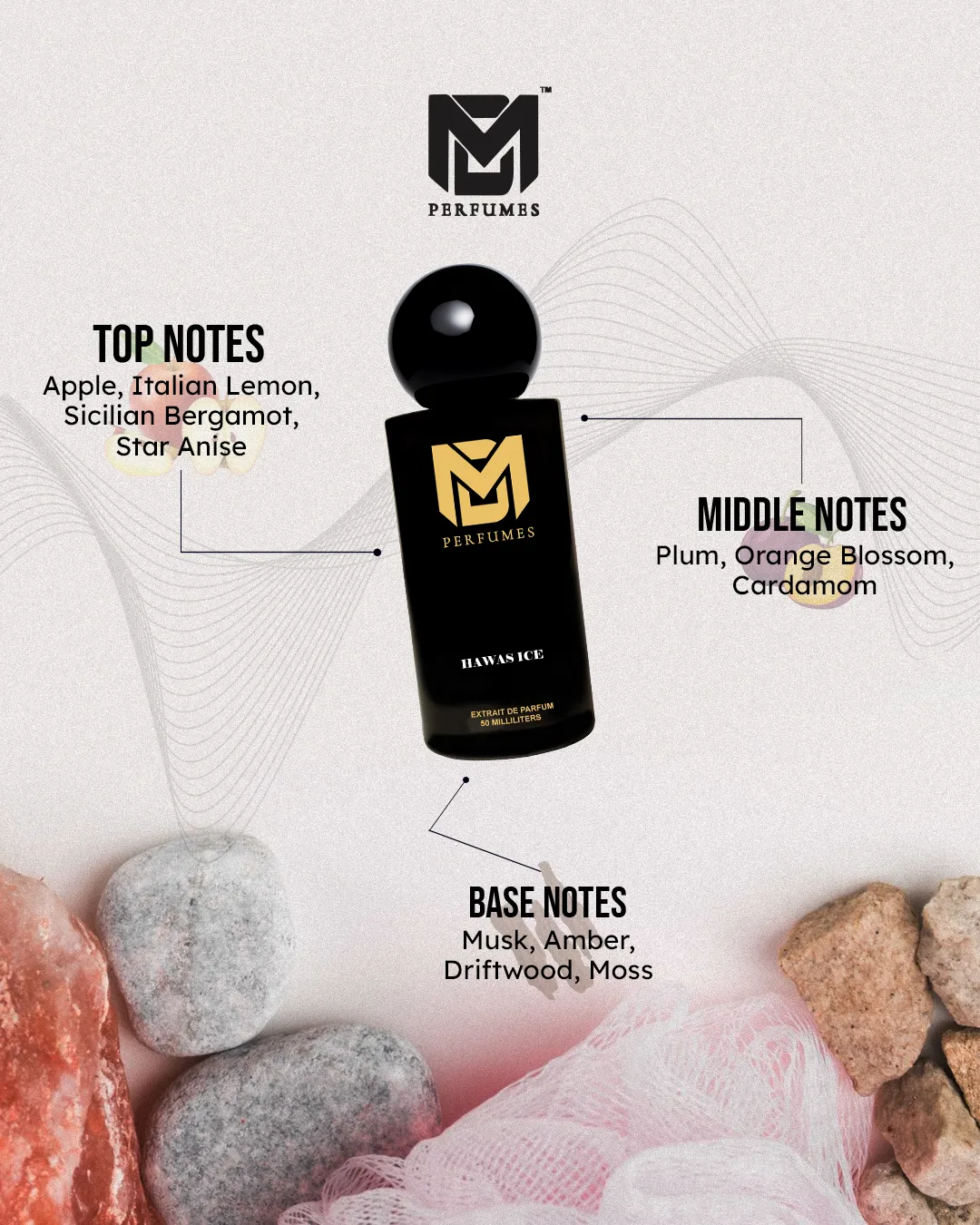 HAWAS ICE is a fragrance of cool energy and modern sophistication. It opens with a crisp burst of bergamot, lemon, and spicy ginger, sharp and invigorating like a breath of icy air. The heart unfolds into lavender, sage, and geranium, aromatic and elegant, adding depth to the freshness. Finally, the scent rests on a bold base of amberwood, musk, and patchouli, leaving a trail that is both cool and irresistibly masculine.