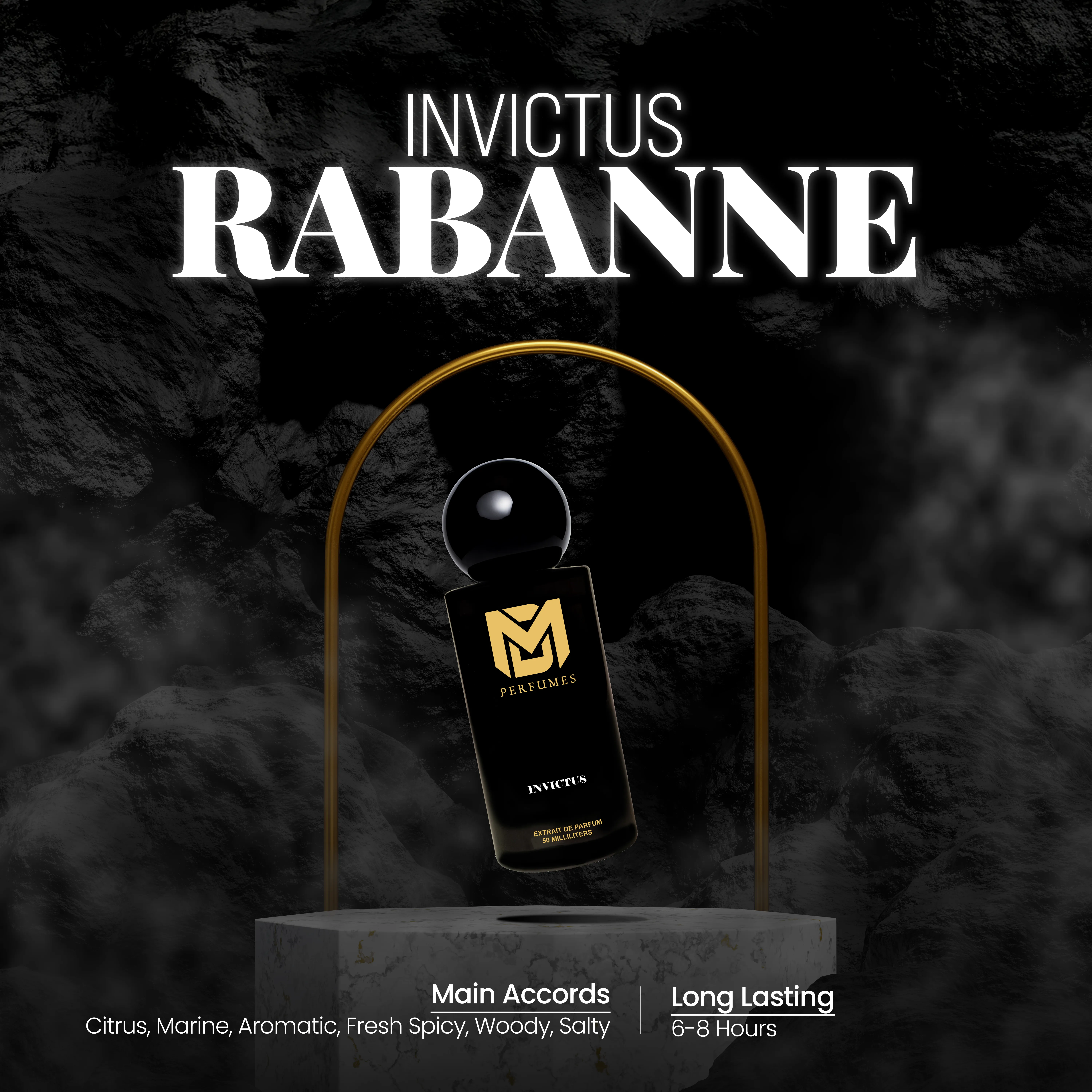 INVICTUS is the fragrance of victory, energy, and unstoppable spirit. It opens with a burst of grapefruit and marine notes, sharp and invigorating, like the first wave of triumph. The heart carries bay leaf and jasmine, adding strength, freshness, and refinement. Finally, a deep base of guaiac wood, oakmoss, and ambergris leaves a powerful and lasting trail.