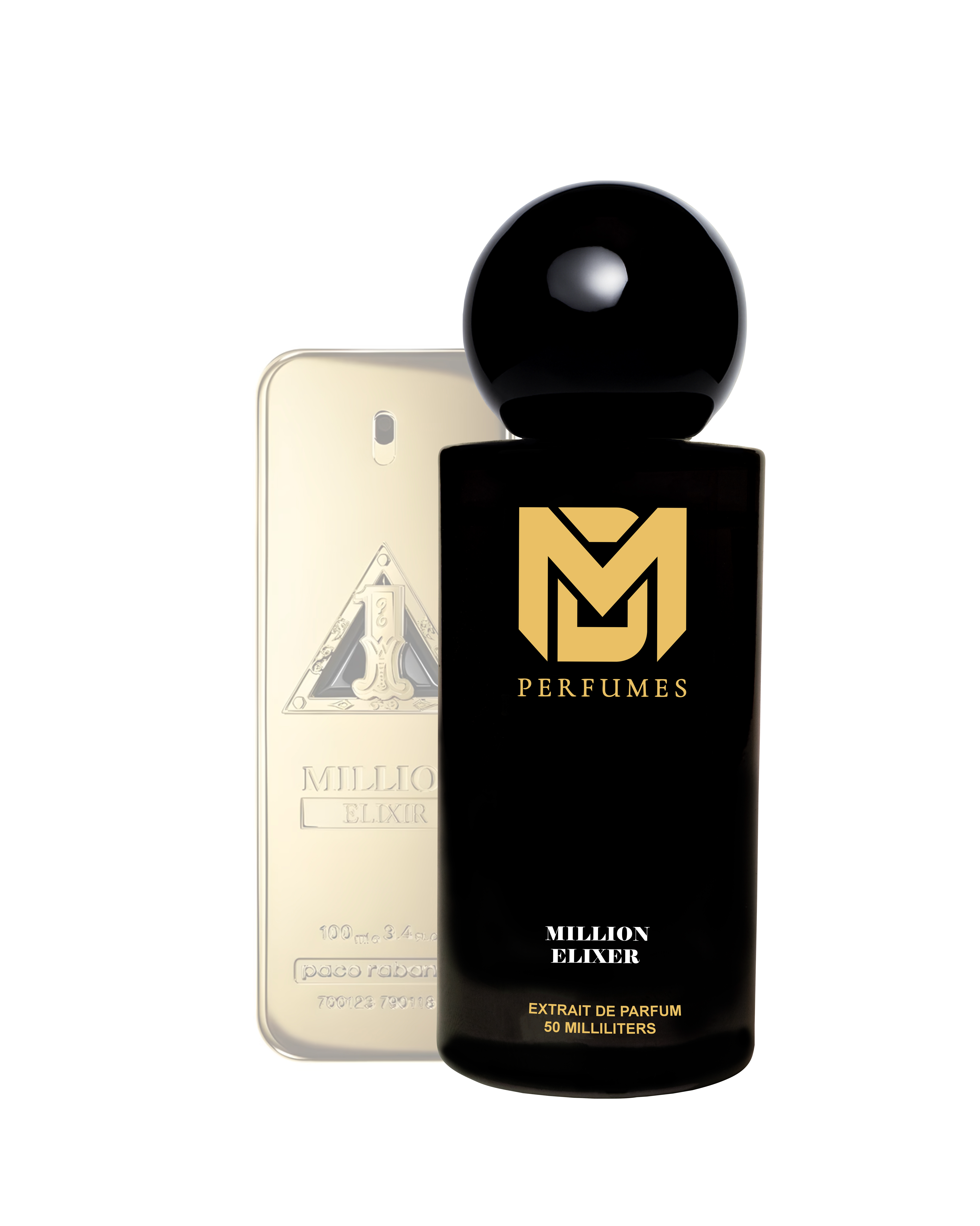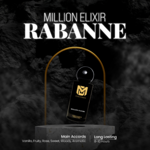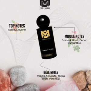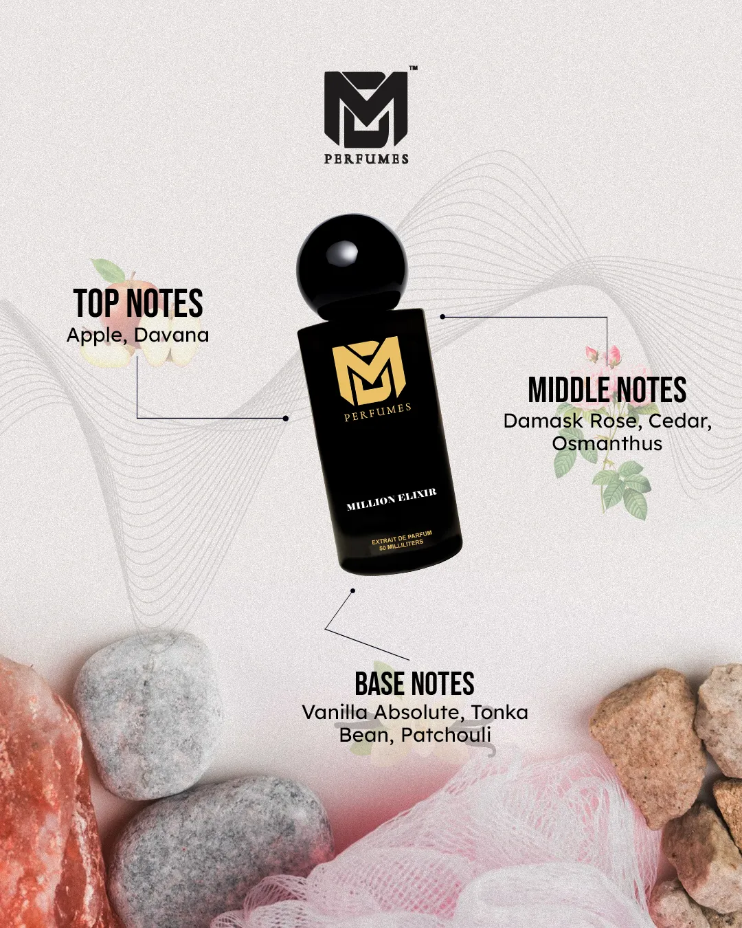 MILLION ELIXER is a fragrance of intensity, depth, and pure sophistication. It opens with the sweet brightness of apple and the aromatic richness of davana, bold yet refined. The heart reveals Damascena rose and osmanthus, layered with cedarwood for warmth and power. Finally, the scent rests on vanilla, tonka bean, and patchouli, leaving behind a rich, long-lasting trail of sensual luxury.