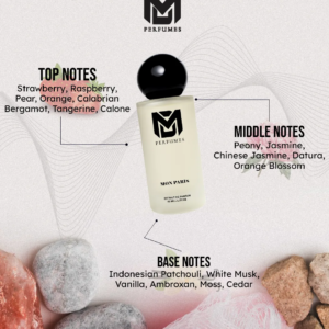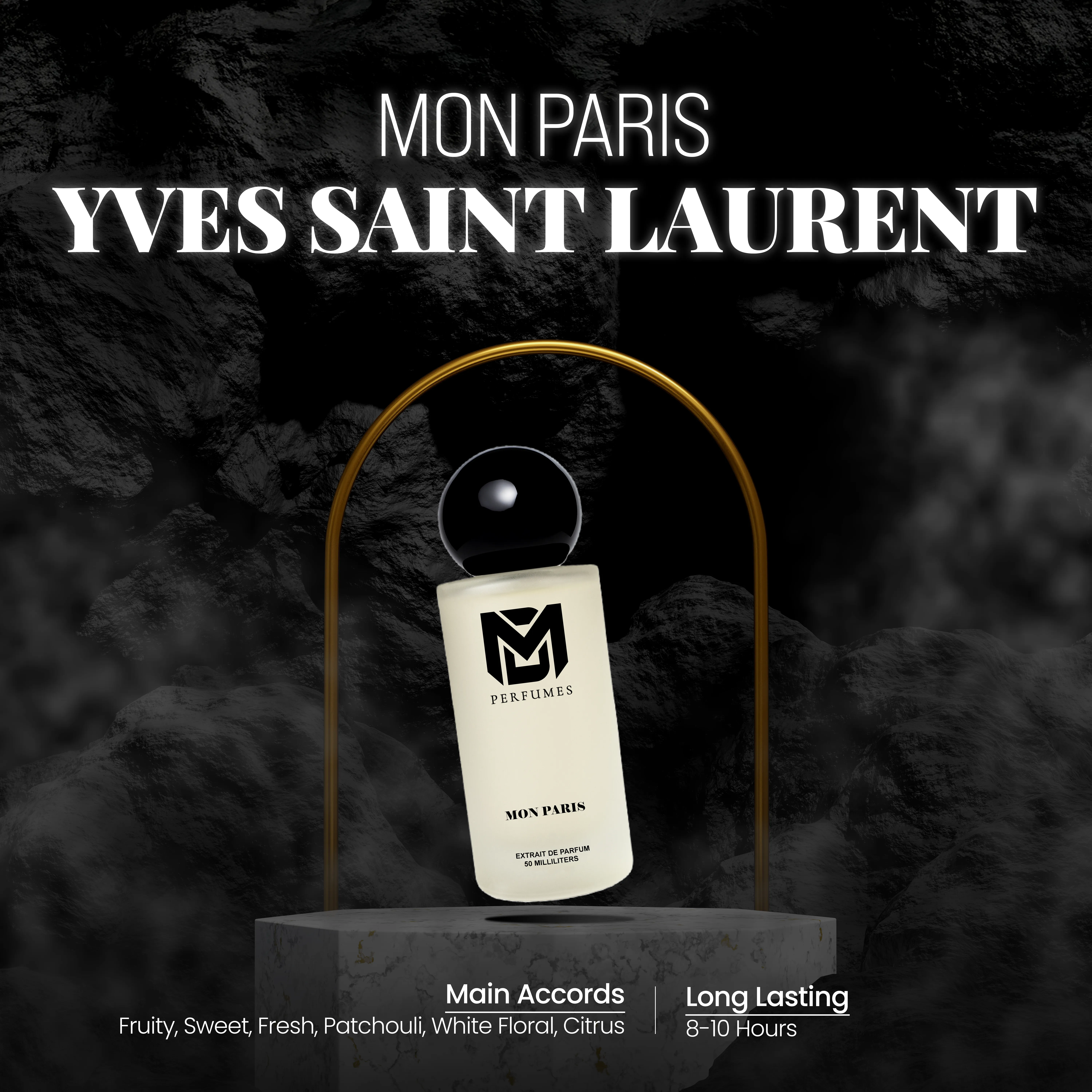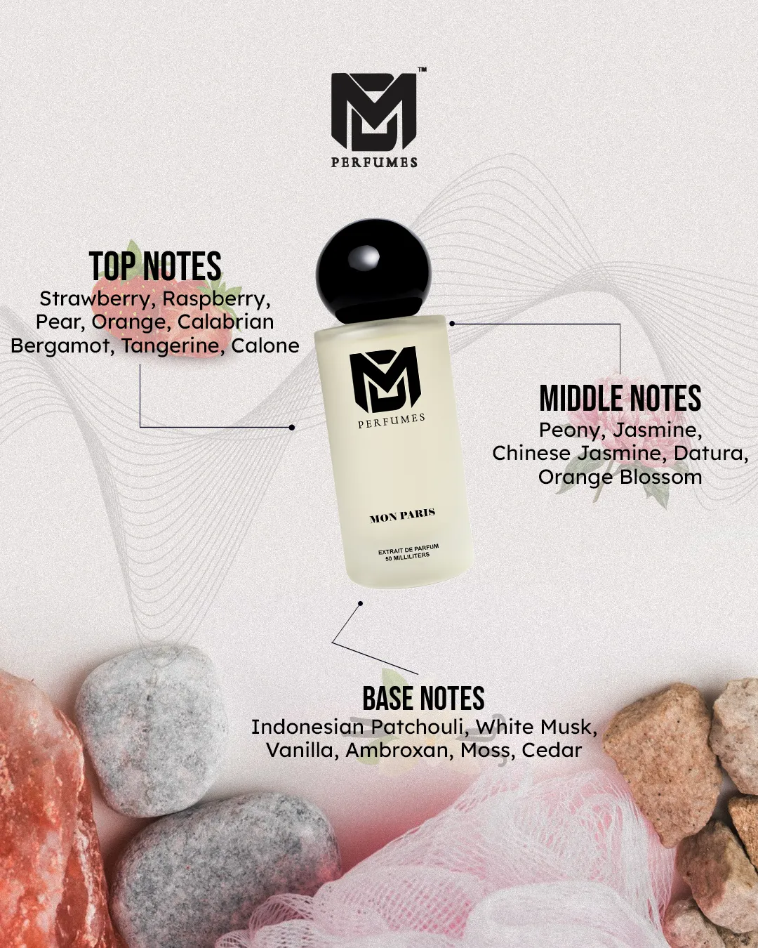 MON PARIS is a fragrance of passion, elegance, and irresistible romance. It opens with a sparkling burst of strawberry, raspberry, and pear, a sweet and vibrant introduction. The heart blossoms into datura flower and jasmine sambac, softened by peony and orange blossom, creating a luminous bouquet. The scent settles into a sensual base of patchouli, musk, and vanilla, leaving a trail that is deep, romantic, and unforgettable.