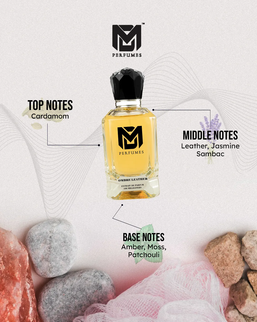 OMBRE LEATHER is a fragrance of strength, freedom, and untamed elegance. It opens with the spicy heat of cardamom, instantly bold and magnetic. The heart unveils sensual leather wrapped with jasmine sambac, creating a raw yet refined depth. Finally, the base of patchouli, amber, and moss grounds the scent, leaving a dark, luxurious trail that lingers with power.