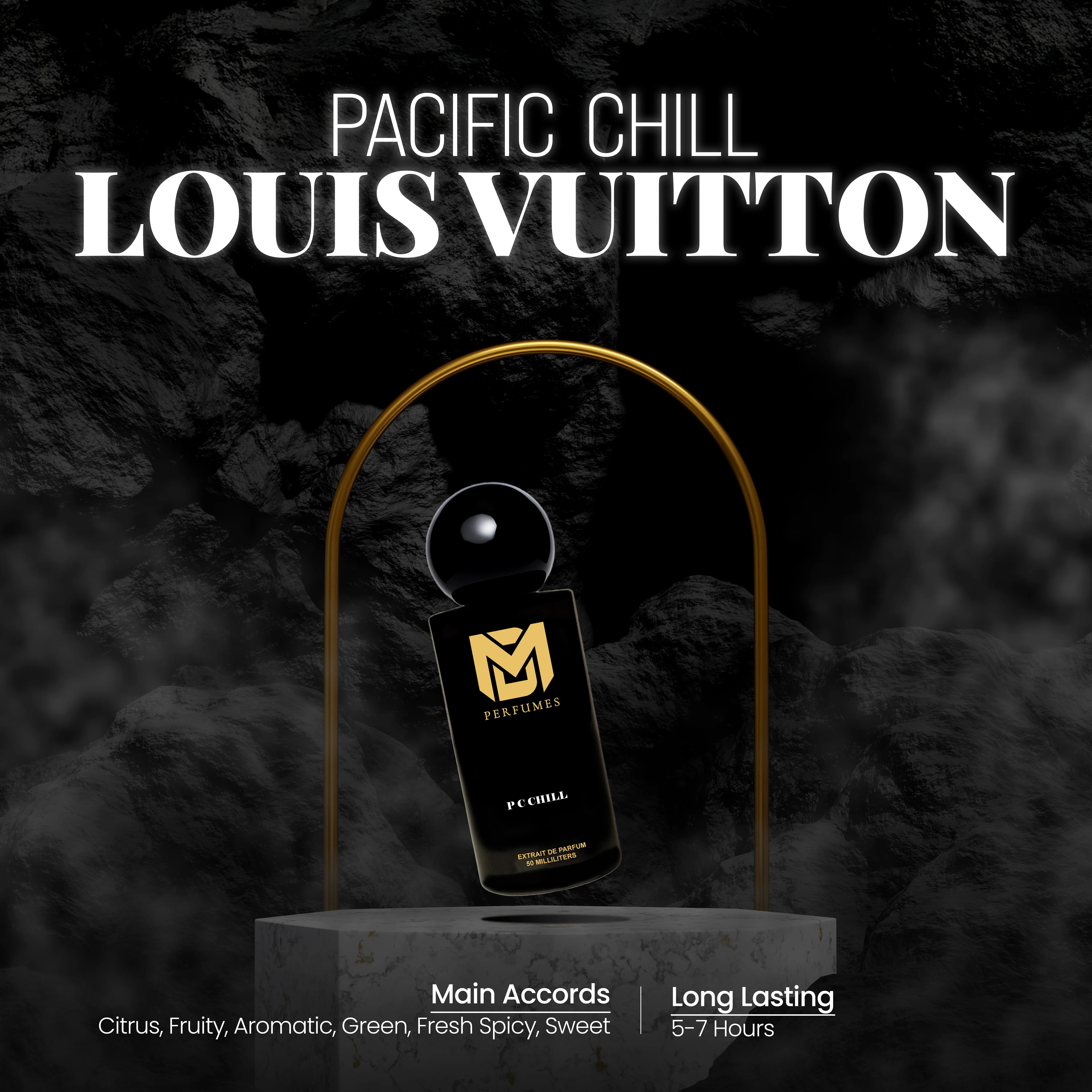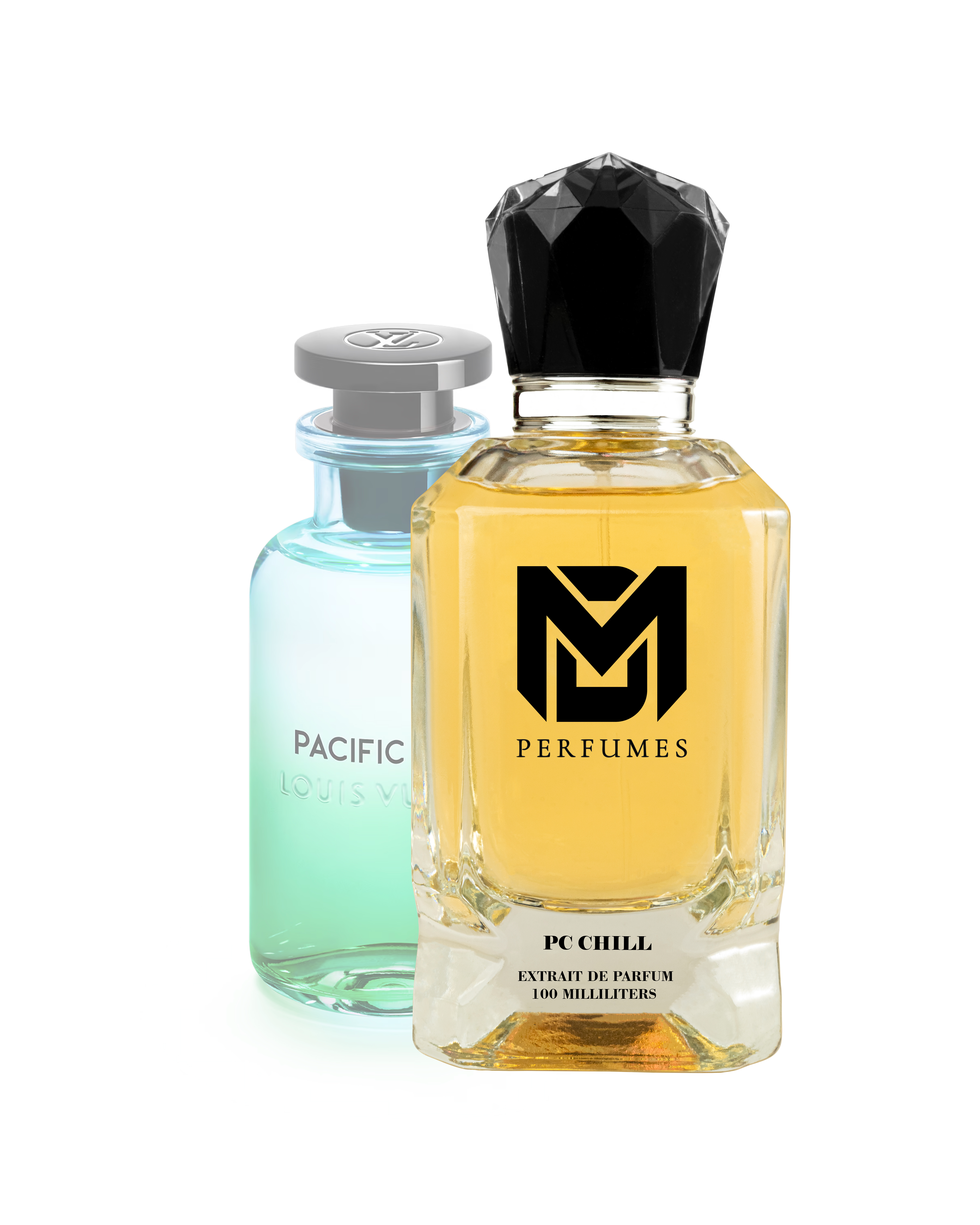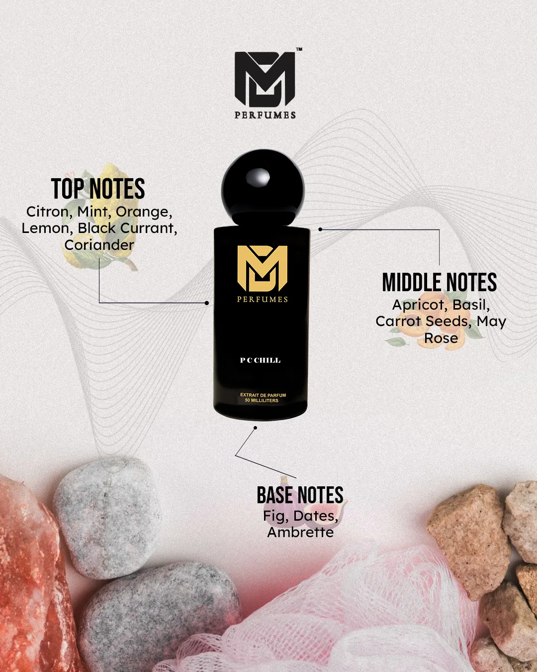 PC CHILL is a refreshing escape captured in a bottle—a scent made for dawn by the sea. It begins with a bright flourish of citrus—lemon, citron, and a hint of coriander—touched with sparkling blackcurrant and mint that spark the senses. In the heart, lively basil, carrot seed, and apricot blend with May rose, adding sweetness and green depth. Finally, the base settles into soft fig, warm dates, and airy ambrette, leaving behind an elegant trail of oceanic freshness and subtle gourmand warmth.