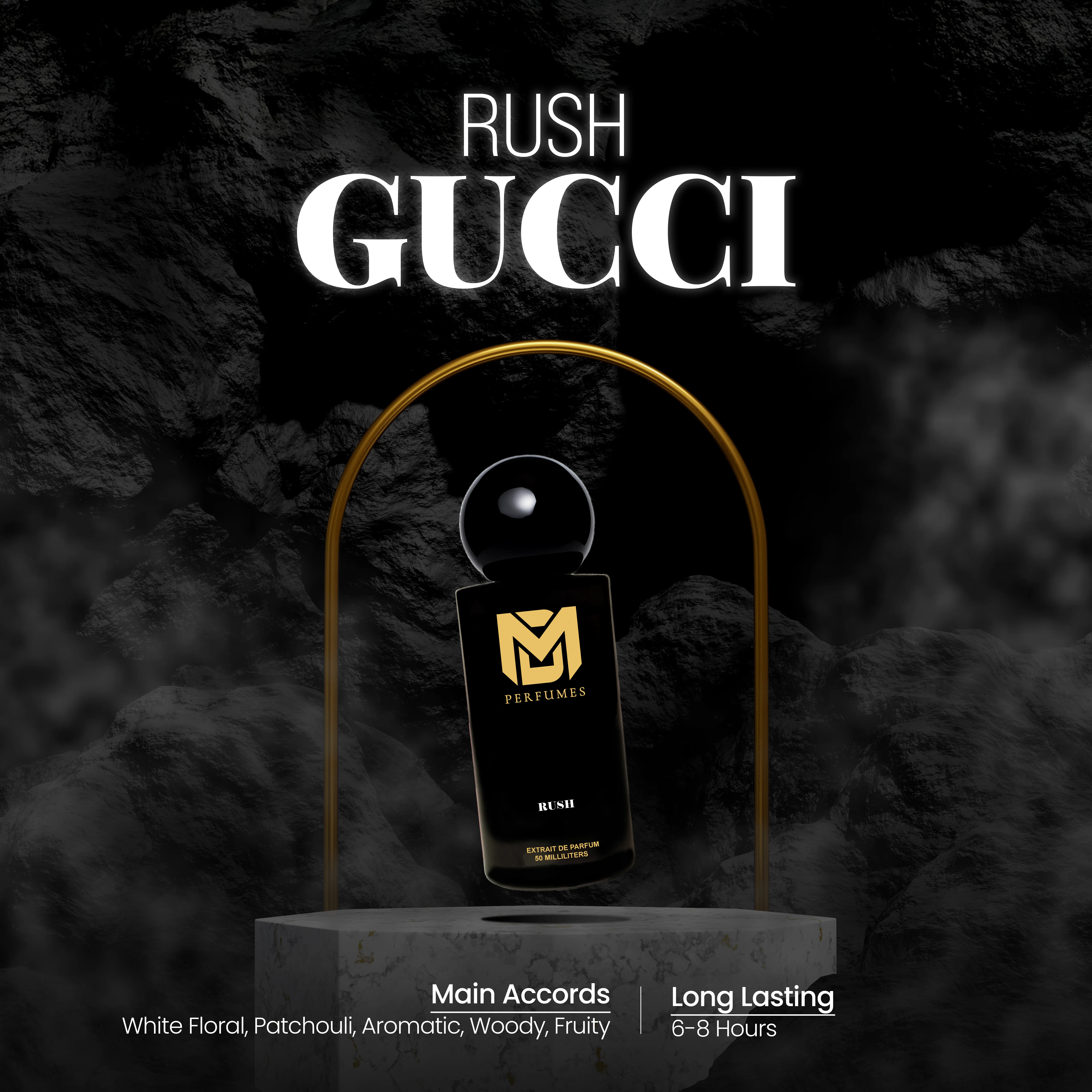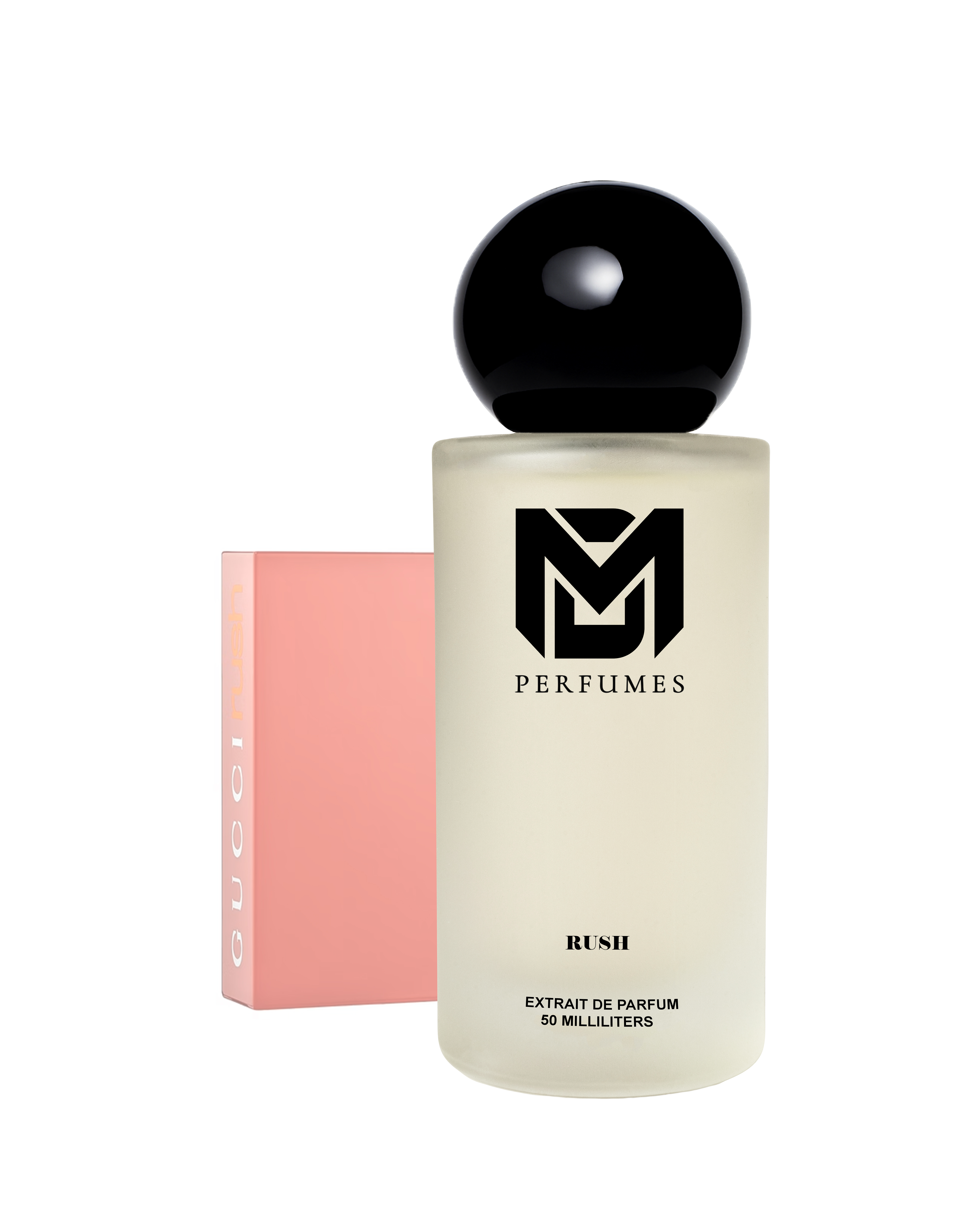 RUSH is a fragrance of passion, spontaneity, and daring elegance. It opens with the sweet juiciness of peach and the brightness of freesia, instantly addictive. The heart blooms with jasmine and rose, accented by the spice of coriander, creating a bold and seductive harmony. Finally, the warm base of vanilla and patchouli lingers on the skin, sensual and unforgettable.