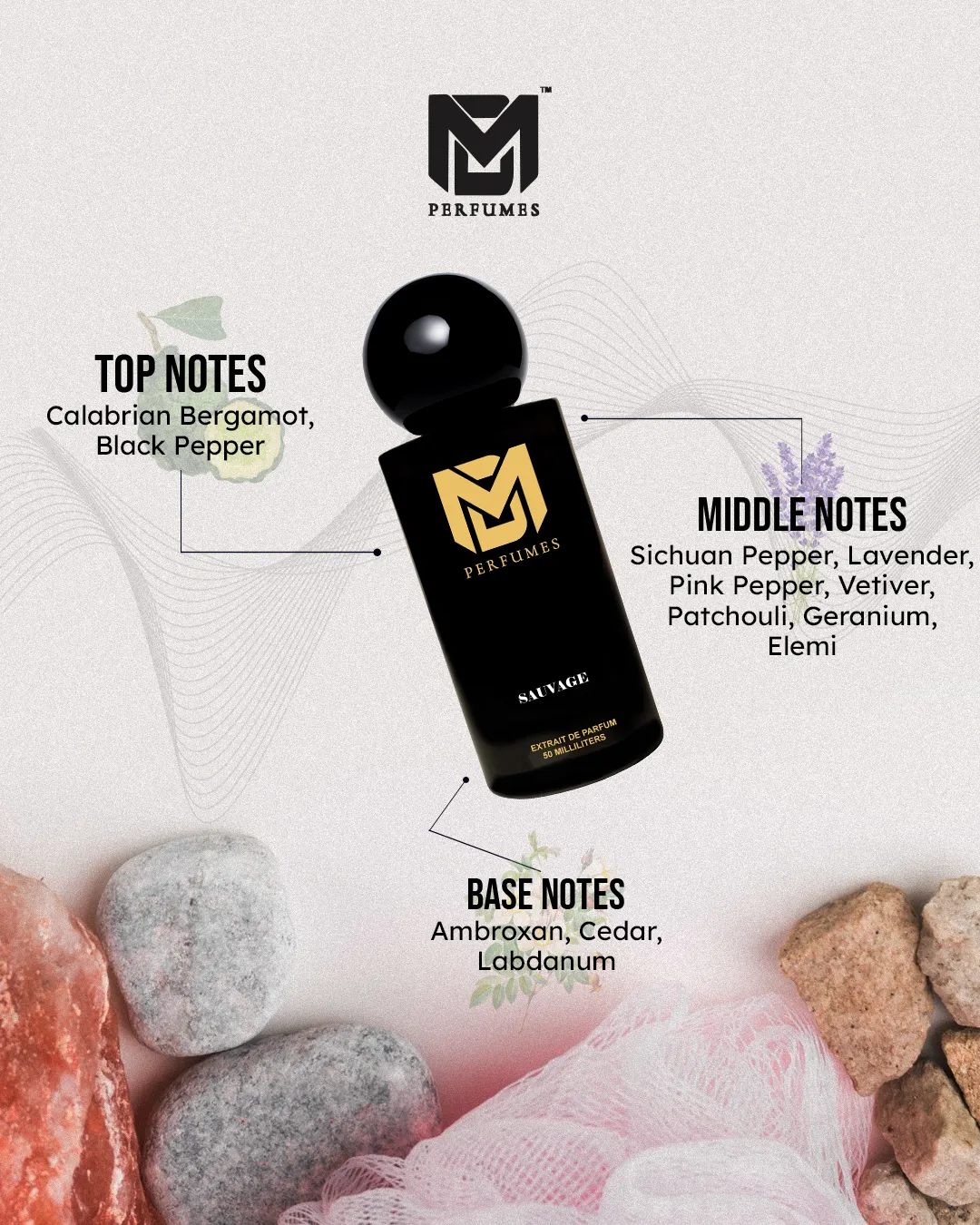 SAUVAGE is the fragrance of untamed freedom and raw elegance. It opens with the crisp brightness of Calabrian bergamot, cut through with the spice of pepper for an immediate surge of energy. The heart brings together lavender, patchouli, and aromatic spices, bold yet refined. Finally, the base of ambroxan and cedarwood delivers a powerful trail that is clean, woody, and magnetic.