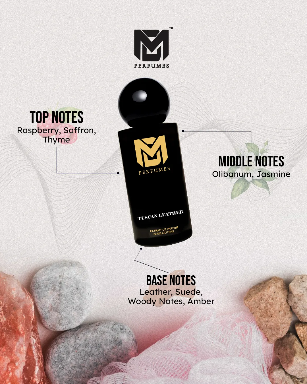 TUSCAN LEATHER is a fragrance of raw power and refined elegance. It opens with the bold sweetness of raspberry, lifted by saffron and thyme, an unforgettable first impression. The heart reveals jasmine and smoky olibanum, adding depth and mystery. The base settles into rich leather, suede, and amber, creating a dark, sensual trail that is both daring and luxurious.