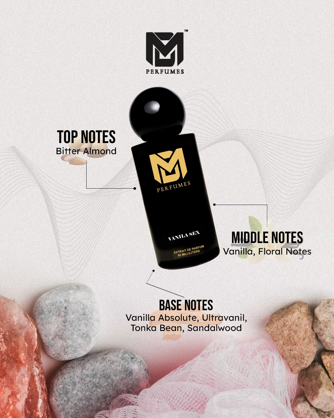 VANILA SEX is a fragrance of indulgence, intimacy, and irresistible allure. It opens with the warm sweetness of almond and rum, accented by a hint of citrus brightness. The heart is a decadent bouquet of vanilla absolute and white florals, creamy and enveloping. Finally, the base lingers with tonka bean, sandalwood, amber, and musk, leaving behind a sensual trail that is both comforting and provocative.