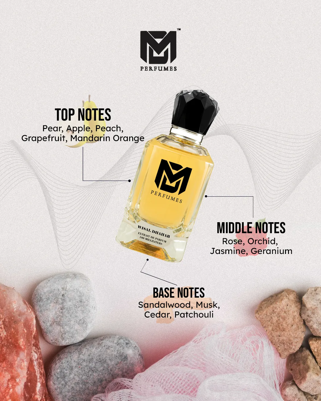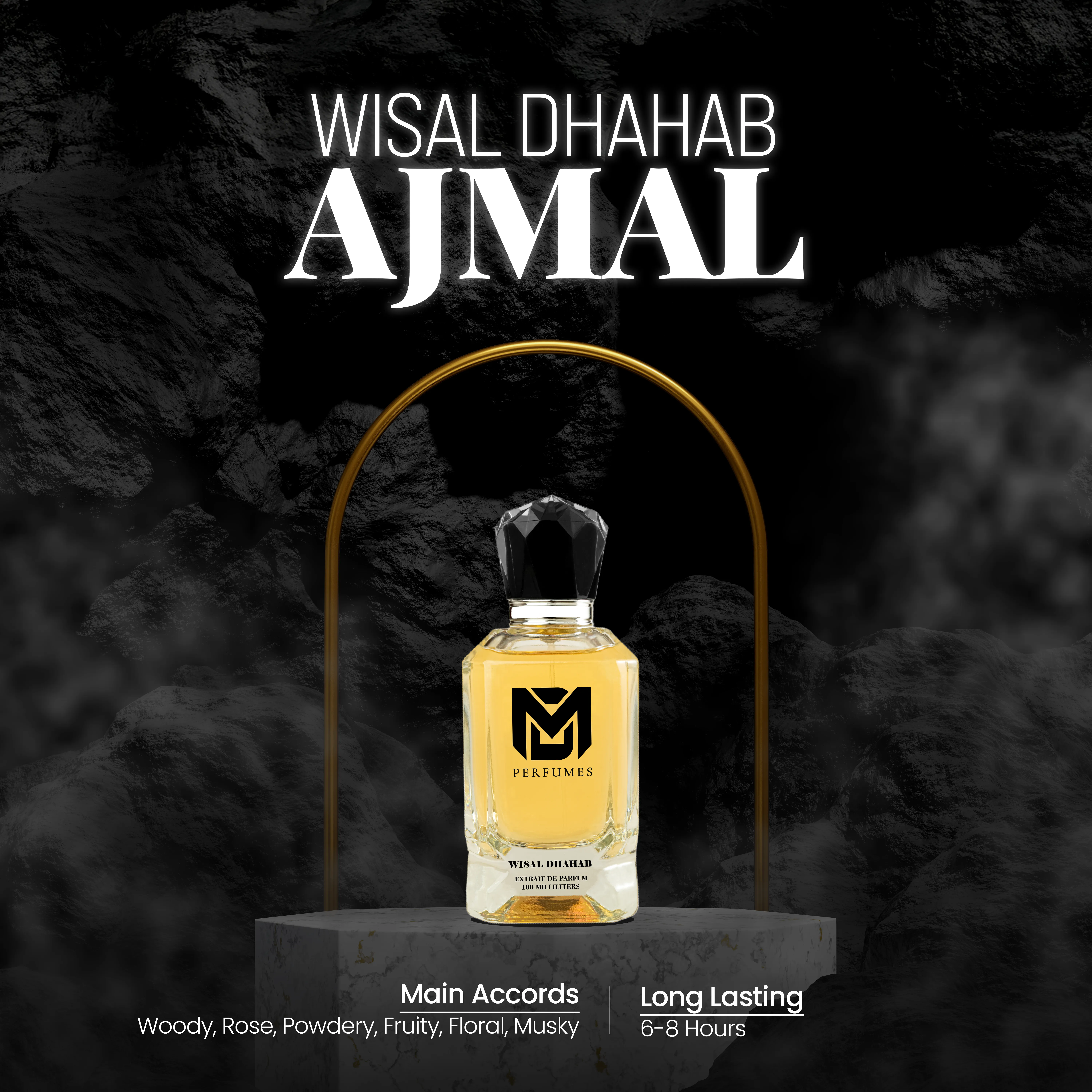 WISAL DHAHAB is a fragrance of radiance, elegance, and golden allure. It opens with a juicy medley of pear, apple, and peach, brightened by citrus notes of grapefruit and mandarin. At its heart, rose, jasmine, and orchid bloom in harmony, creating a bouquet of pure sophistication. The base of musk, cedarwood, and sandalwood lingers softly, leaving a trail that is both warm and irresistibly graceful.